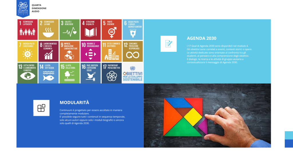 Ogni argomento ha un’area tematica con moduli in audio immersivo, eBook e attività. In questo modo è possibile seguire il corso completo o alcune sue parti in maniera stand alone.