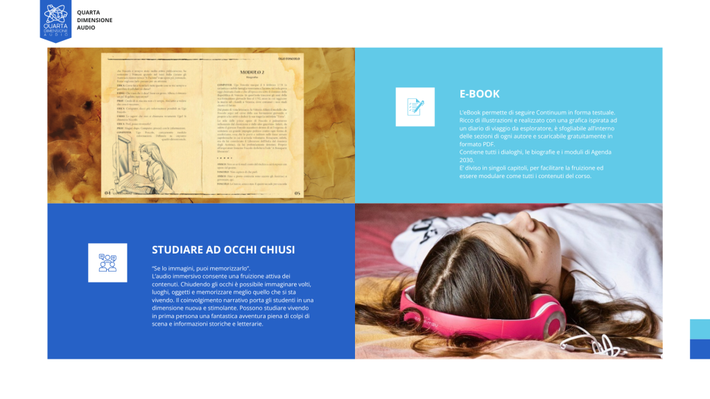La nostra offerta didattica propone agli studenti un nuovo modo di apprendere e studiare. L’audiolibro realizzato in audio immersivo permette di fruire del contenuto senza necessità di testi, video o strumenti di accessibilità dedicati. Per vivere l’esperienza immersiva sono necessarie delle comuni cuffie e non occorrono altri supporti specifici. L’ascolto viene ottimizzato per ogni tipo di supporto, indipendentemente dalla fascia qualitativa.